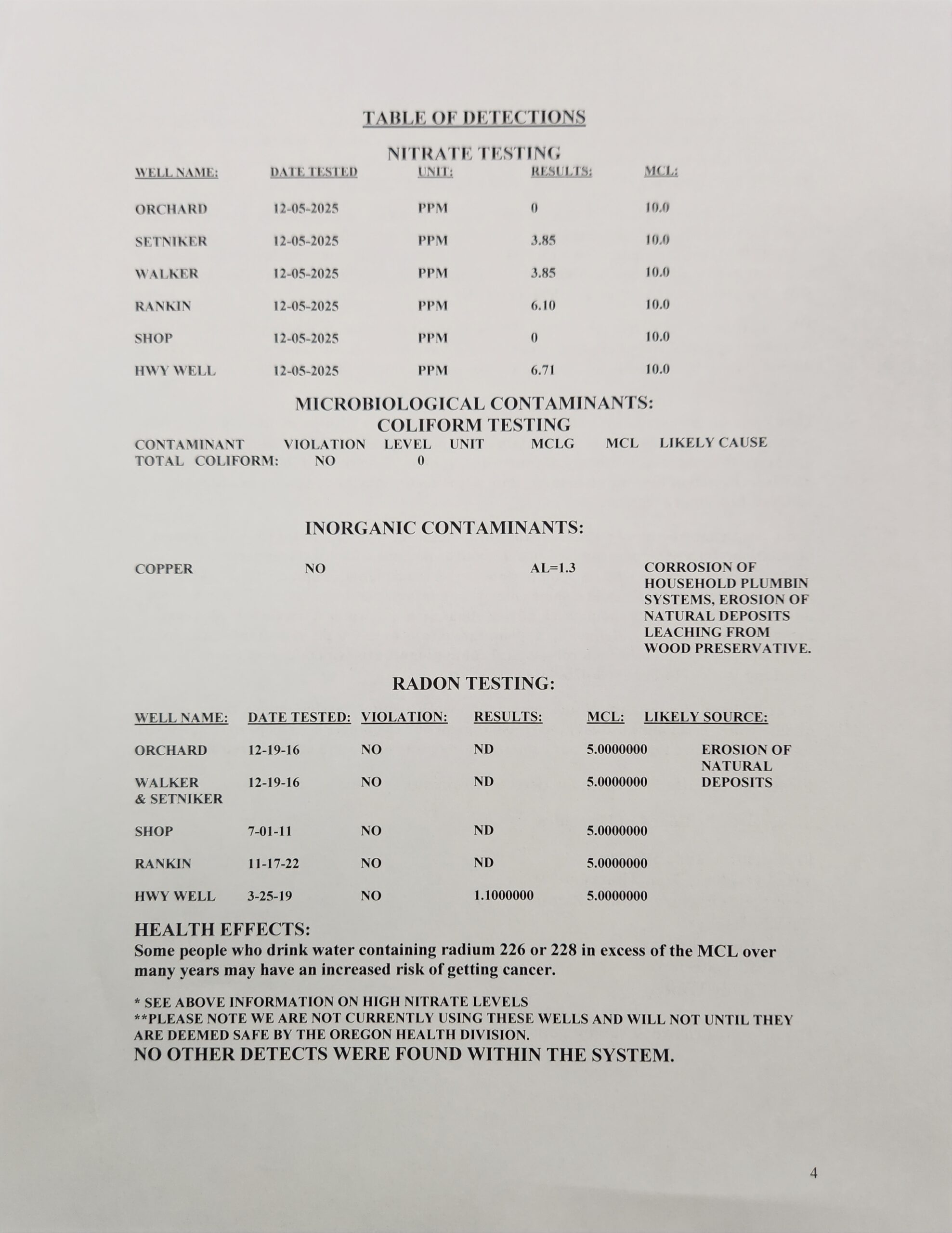 Rickreall Community Water Association routinely monitors for constituents in your drinking water according to Federal and State laws.  This table shows the results of our monitoring for the period of January 1st to December 31, 2025. All drinking water, including bottled drinking water, may be reasonably expected to contain at least small amounts of some constituents.  It’s important to remember that the presence of these constituents does not necessarily pose a health risk.